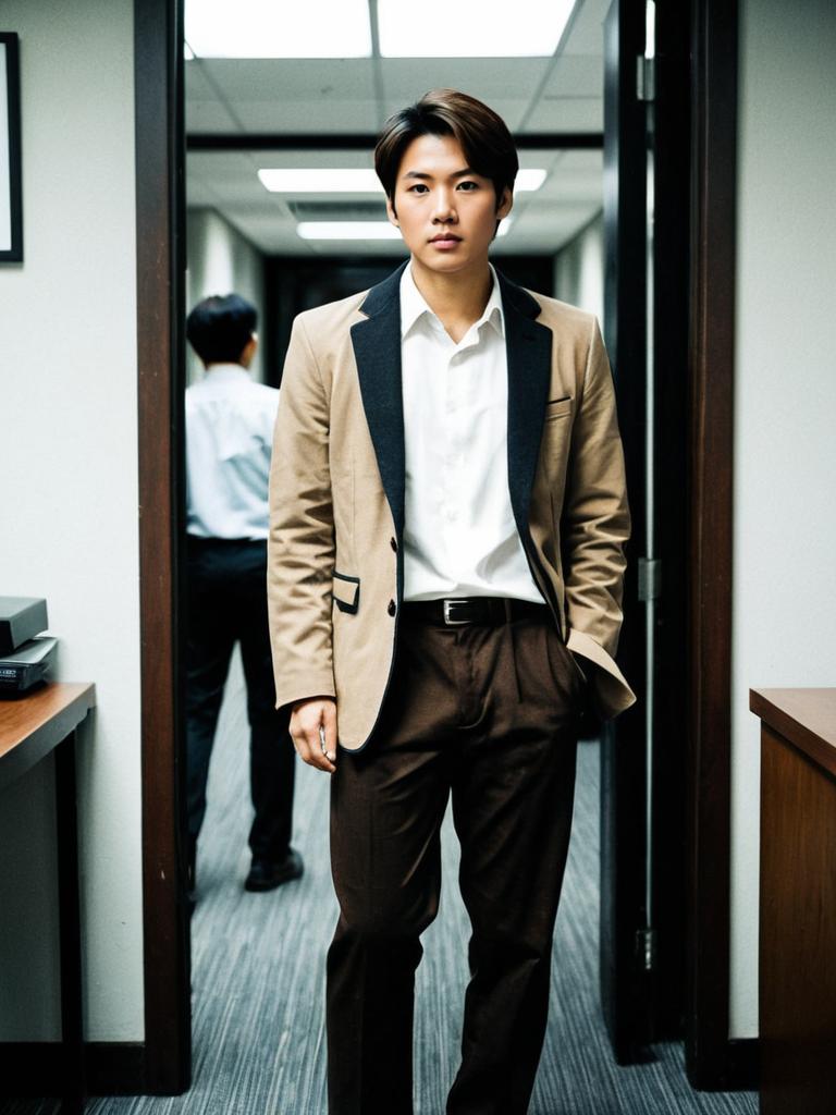 Office gown stylish costume, solo, 1boy, male focus, realistic, brown hair, jacket, pants, shirt, white shirt, brown jacket, black pants, looking at viewer, standing, asian, closed mouth, indoors