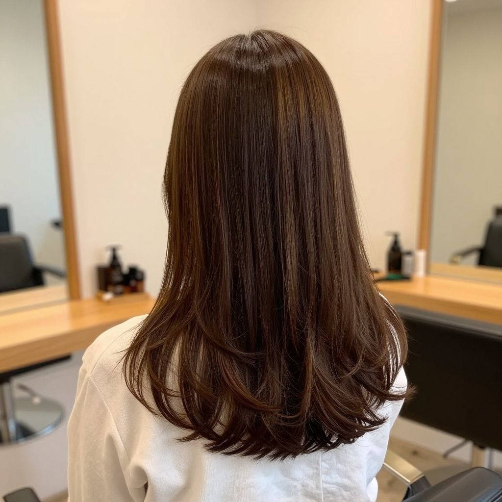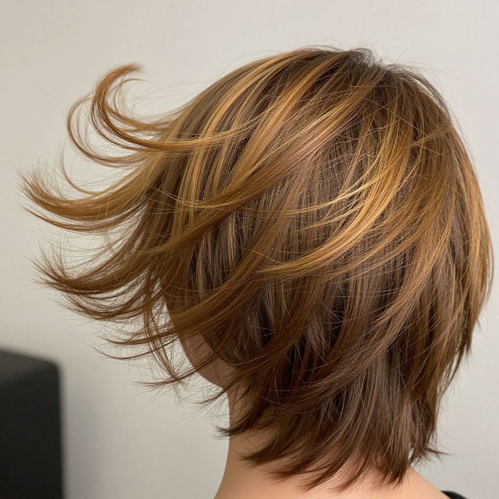 Photograph of a person's head and shoulders, viewed from the side. They have short, layered brown hair with subtle blonde highlights, styled in a windswept, slightly messy manner. The hair has a glossy texture and appears healthy. The background is plain white, providing a stark contrast that highlights the hair's color and texture. The person's skin is partially visible, showing a fair complexion. The image focuses on the hair, with no other objects or distractions in the frame. The lighting is bright and even, emphasizing the natural colors and layers of the hair.