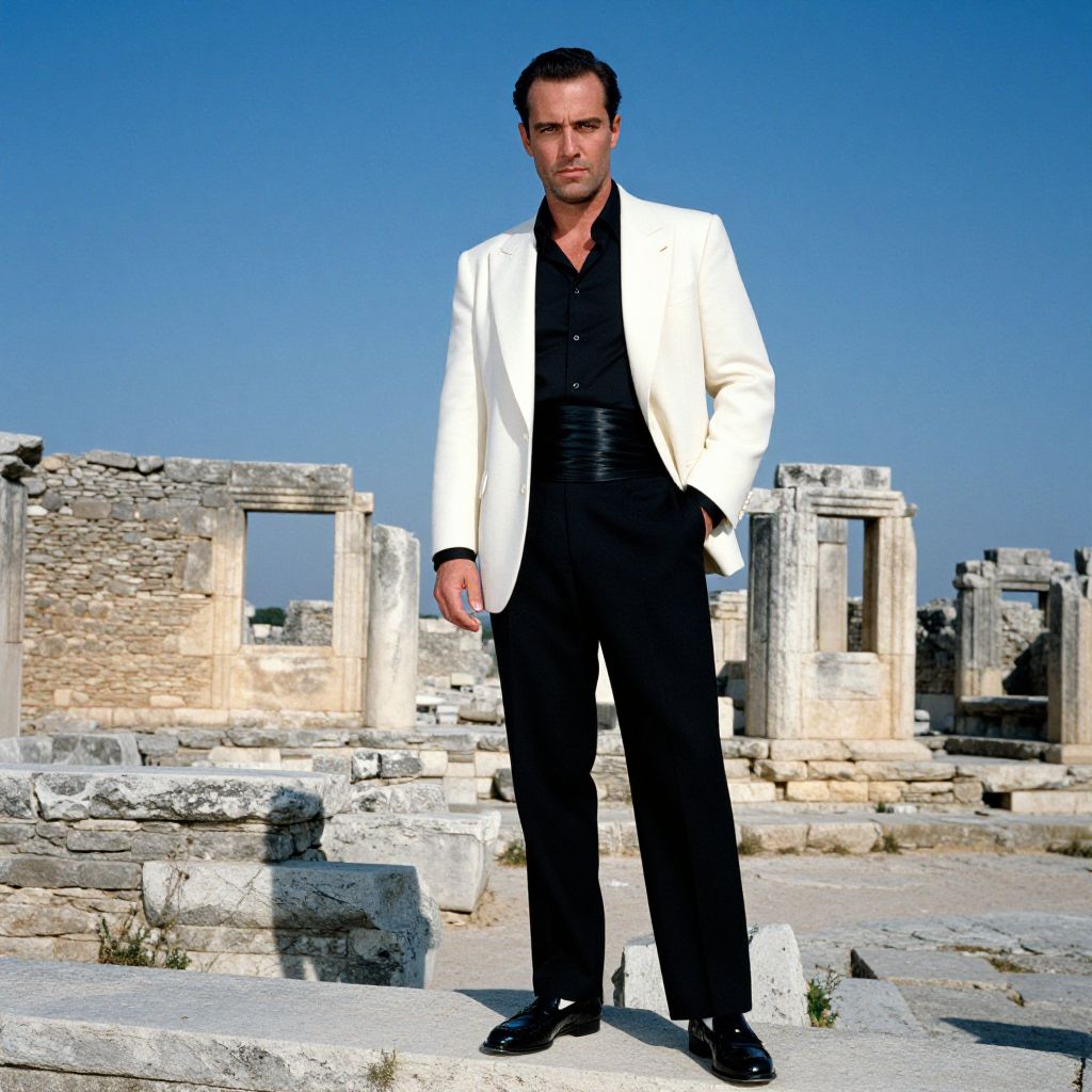 A man, ivory dinner jacket, black dress shirt, black silk cummerbund, black dress trousers, patent leather loafers, ancient stone ruins, kodacolor analog film, confident expression, vibrant blue sky. Man has masculine face and piercing eyes
