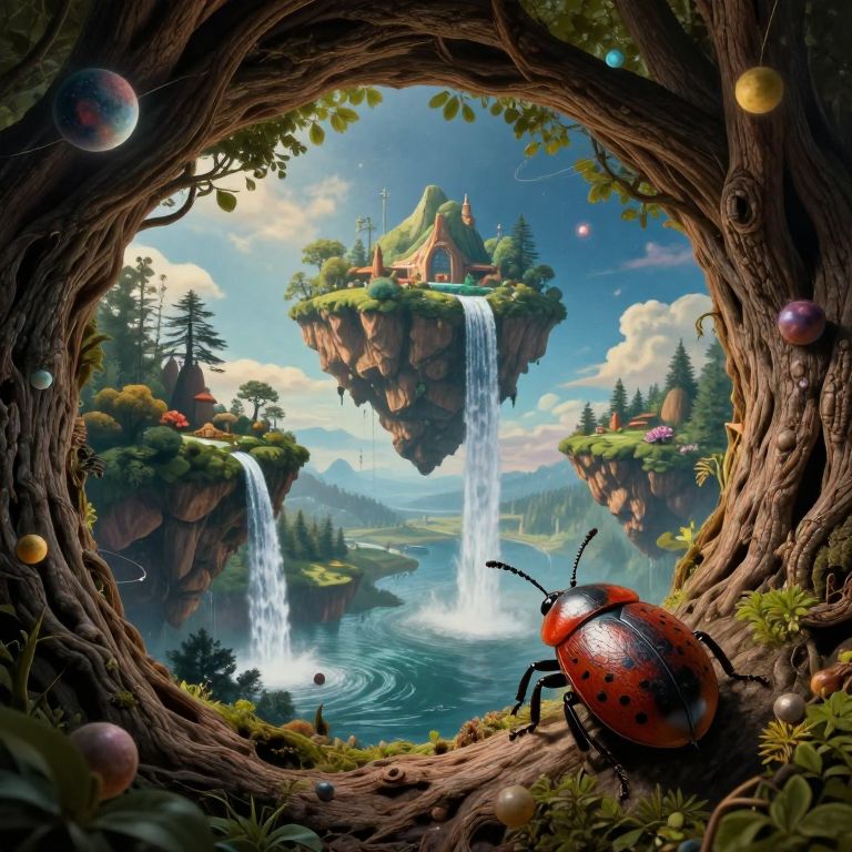Dreamy digital painting of a whimsical, fairy-tale landscape seen through a tree hollow, featuring a red beetle, floating islands, waterfalls,