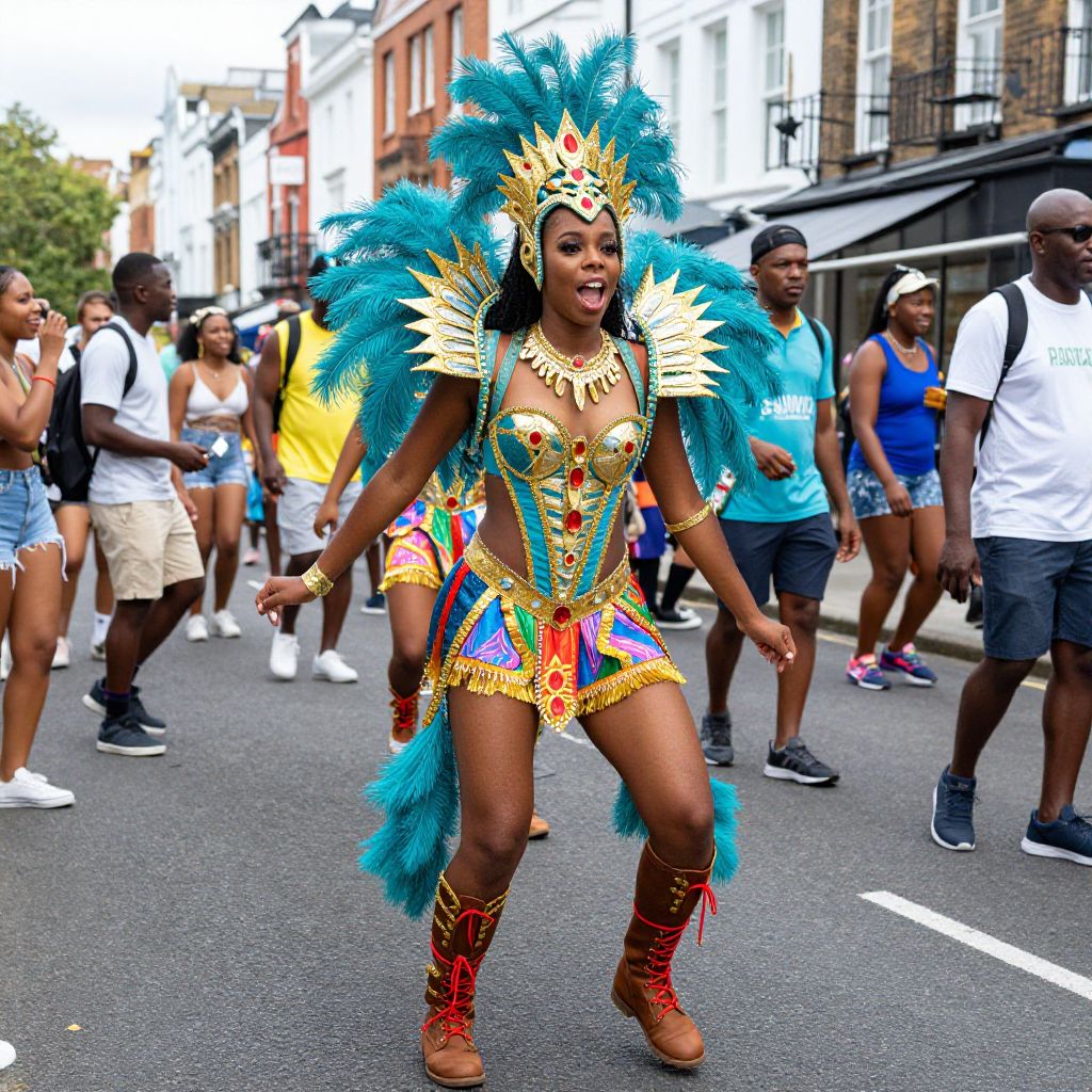 Vibrant Notting Hill Carnival costume featuring a striking turquoise headdress with gold accents, a detailed gold and teal bodice, a colorful skirt adorned with red jewels, and brown boots with red laces, worn by a performer dancing energetically amidst a bustling street scene filled with spectators.