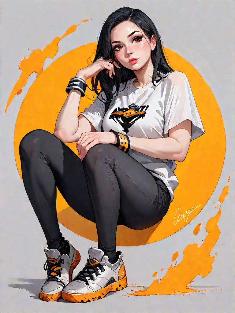 Digital illustration of a young woman with black hair wearing casual streetwear. She is dressed in an oversized white graphic t-shirt featuring an eagle motif in black and orange, paired with black leggings. Her accessories include silver bangles on one wrist and a golden cuff on the other. She is also wearing white and orange sneakers. The background is a light grey with an orange circular design behind her.