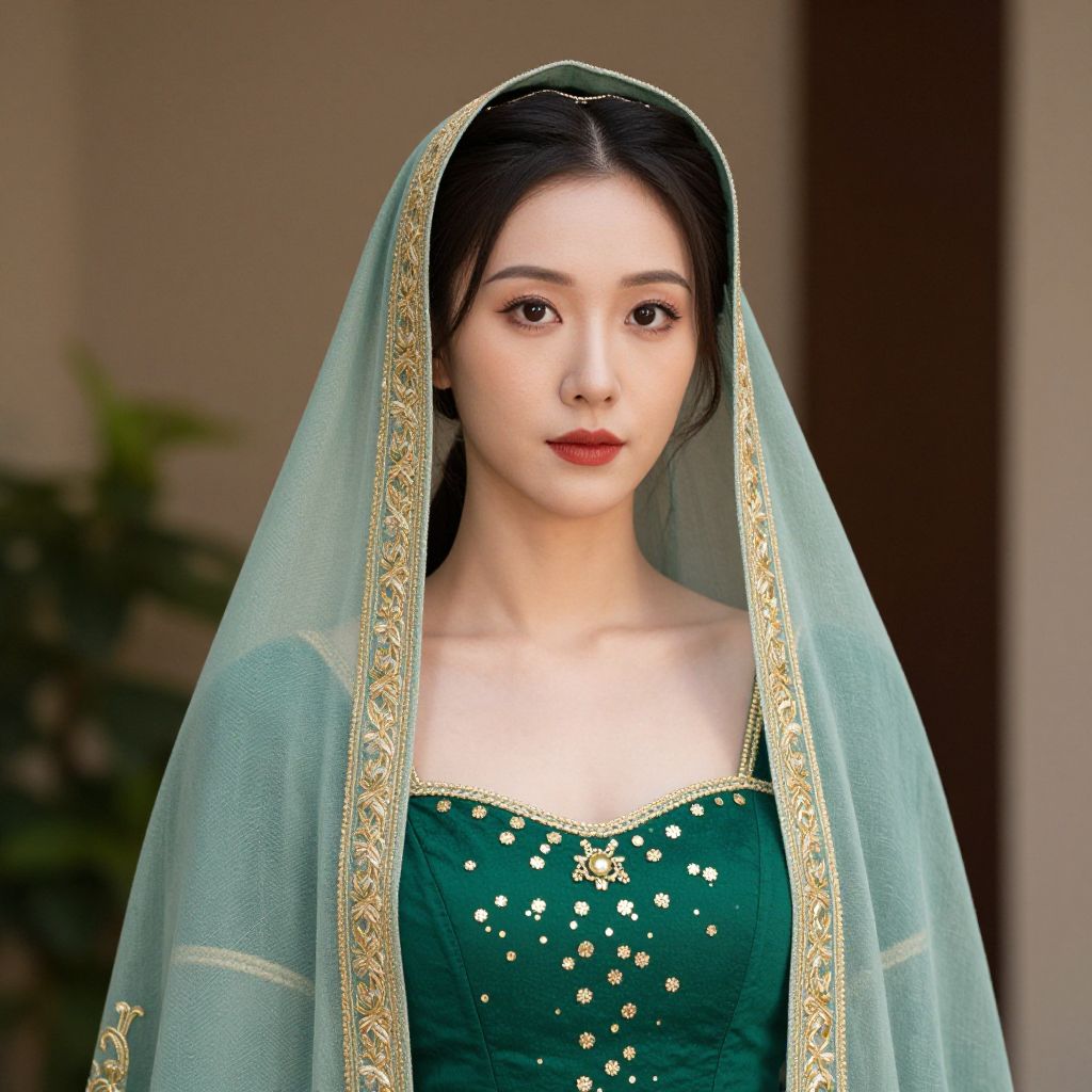 Photograph of an East Asian woman with fair skin, wearing a green traditional dress and sheer green veil with gold trim, adorned with gold sequins,