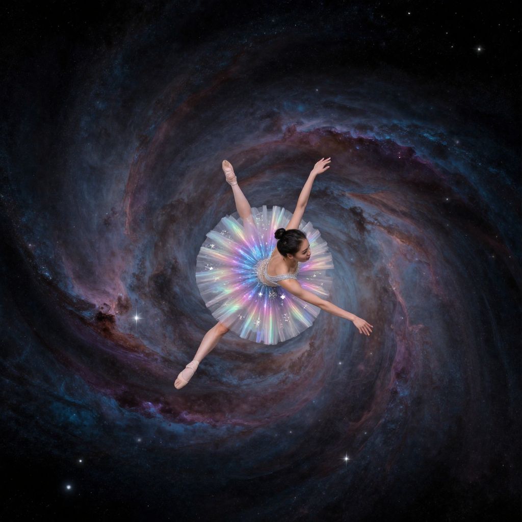 Digital artwork of a ballerina with arms outstretched, wearing a sparkling tutu, floating in a swirling galaxy with vibrant cosmic colors.
