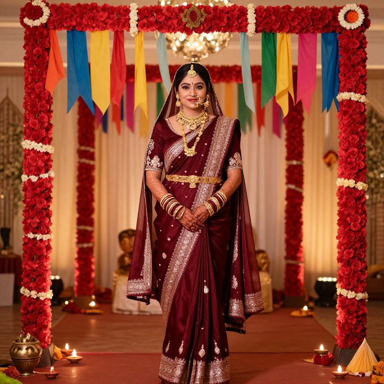A traditional Hindu bride in a deep maroon sari with intricate hand-stitched designs, her face adorned with gold bangles and a small bindi, standing under a red-painted bridal arch with colorful flags fluttering, surrounded by cultural elements like diyas, kumkum, and floral garlands in a festive wedding hall.