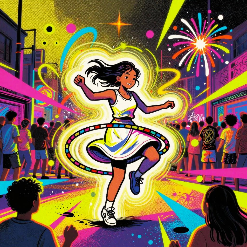 Bold line-drawn rollerblader gliding fast in kinetic motion across graffiti-gray urban plaza with benches, surrounded by speed trails, chevron arrows, neon streaks, scattered leaves; colorful bursts like fireworks; thick black outlines; graffiti chalk-and-acrylic blend; bright textured background with halftone grain; mural-style composition; playful urban energy; motion lines and spray paint speckles; high contrast; saturated primaries with neon accents; joyful rhythm; iconic street art inspired composition