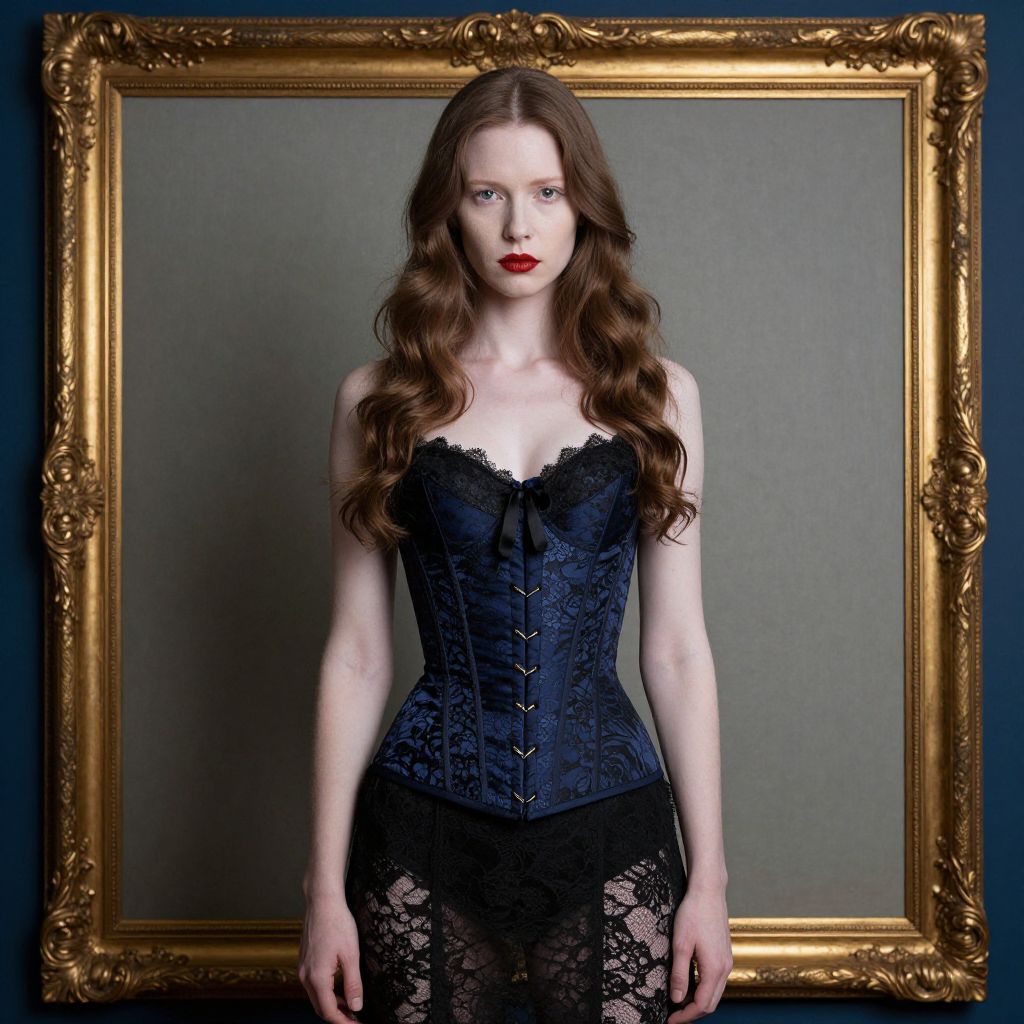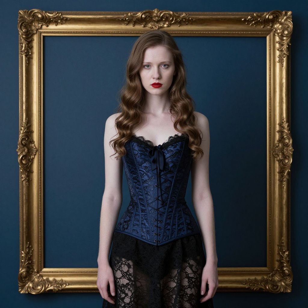 A photograph of a pale-skinned woman with long, wavy brown hair and red lipstick, standing in front of a large, ornate gold-framed blank canvas. She wears a dark blue, lace-up corset with black lace details and a matching black lace skirt. Her expression is serious, and she stands with her arms relaxed by her sides. The background is a deep blue.