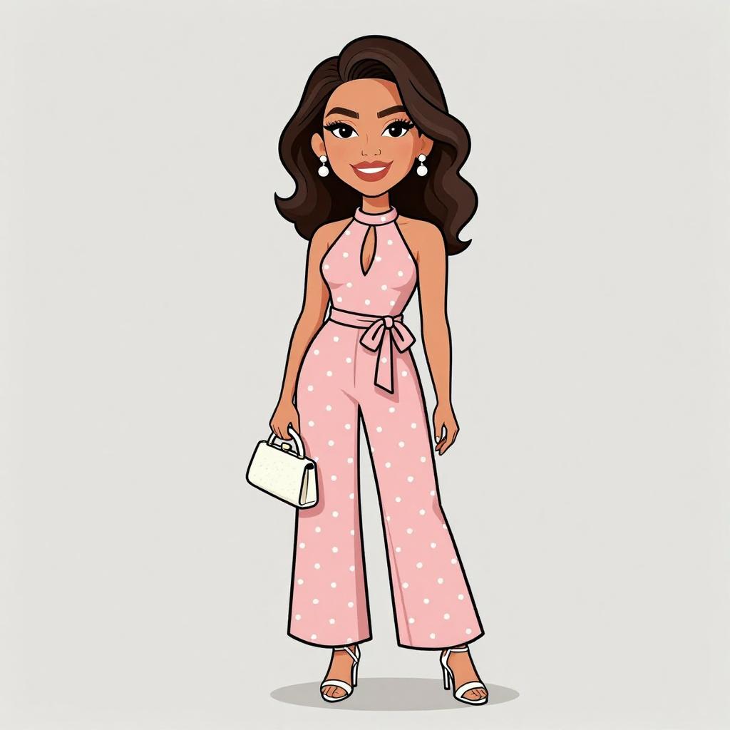 This is a digital cartoon-style illustration of a confident woman with medium brown skin and wavy black hair, smiling warmly. She wears a sleeveless, pink jumpsuit adorned with white polka dots, tied at the waist with a light pink bow. She holds a white clutch purse in her right hand and wears white open-toed heels. Her large, expressive eyes are accentuated with eyeliner, and she has white pearl earrings. The background is plain white, making her the focal point of the image. The overall style is colorful and vibrant, with clean lines and a playful, modern aesthetic.