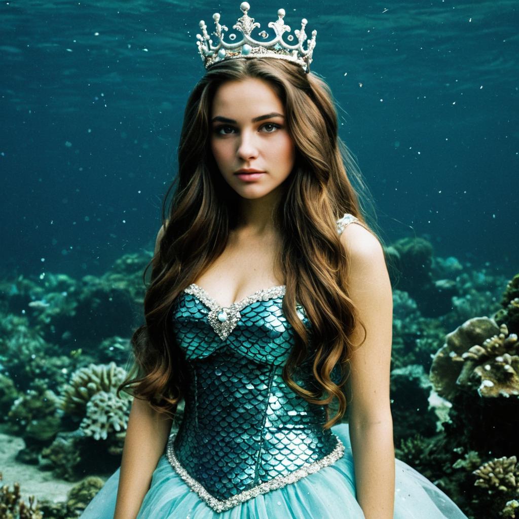Princess mermaid costume,1girl,solo,long hair,brown hair,dress,crown,looking at viewer,tiara