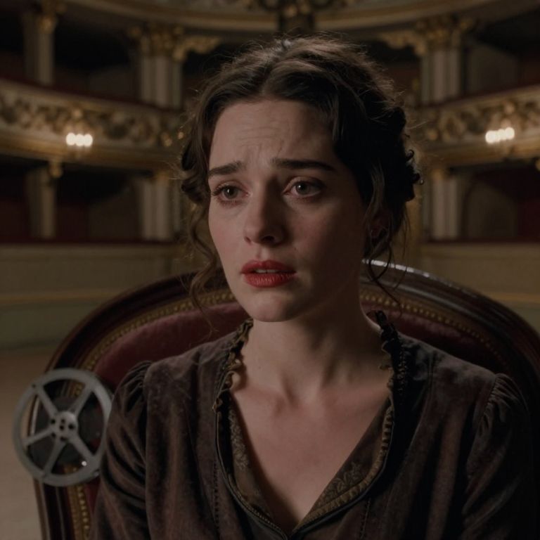Close-up of a silent film tragic heroine with soft makeup, subtle red lips, and dramatic, expressive eyes, seated on a velvet chair in an abandoned opera house, the grand architecture behind her glowing faintly with candlelight, a faint film reel lies beside her, emotionally intense and realistic lighting emphasizing her sorrowful gaze.