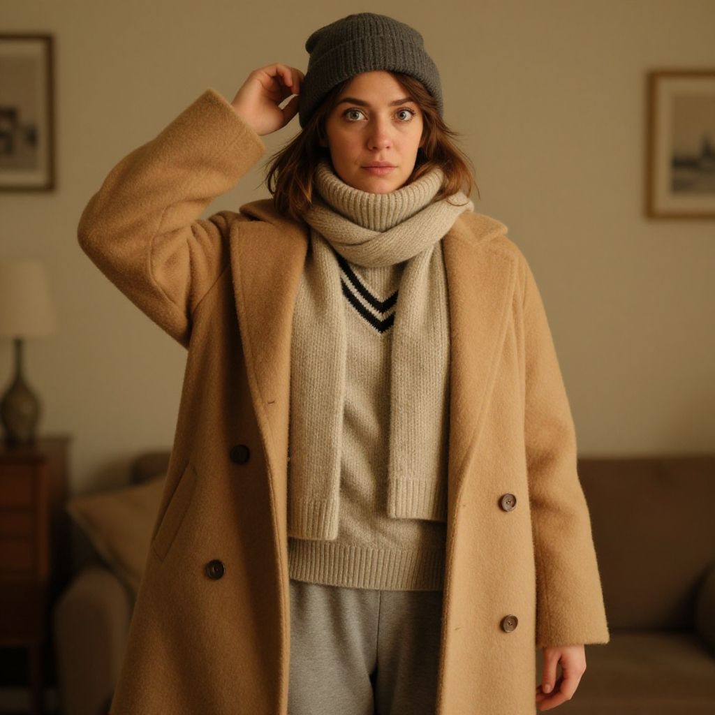Photograph of a young woman standing indoors, wearing a beige wool coat, gray sweatpants, a cream-colored knitted turtleneck, and a dark gray knit beanie. She has medium-length brown hair and light brown eyes, with a neutral expression. Her right hand adjusts the beanie. The background features a beige couch, a wooden side table with a lamp, and framed pictures on the wall. The lighting is warm, creating a cozy atmosphere. The overall style is casual and autumnal.