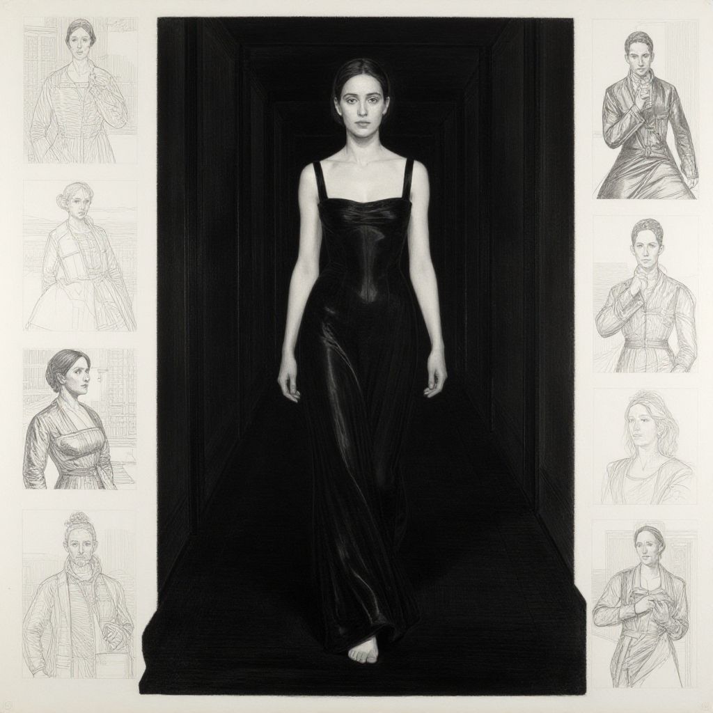 This black-and-white digital drawing features a central, full-length portrait of a woman with light skin and dark hair, standing against a dark, textured background. She wears a sleek, black, sleeveless dress with a square neckline and thin straps, and she stands barefoot. Surrounding the central image are six smaller, monochromatic sketches of the same woman in various poses, rendered in a line-art style. The central portrait is highly detailed, contrasting sharply with the simpler, more sketch-like surrounding images, creating a layered, visual narrative. The overall style is minimalist and modern.