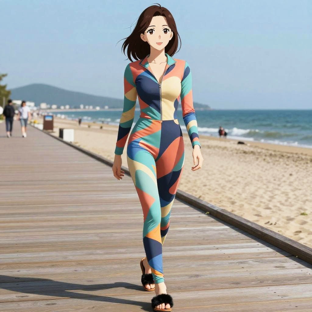 A svelte woman in a fitted jumpsuit with a colorful abstract print, long sleeves, and a front zipper, paired with black fur-lined slip-on sandals, strolling along a seaside boardwalk, in the visual style of ufotable. Sexy. Pretty face and beutiful eyes