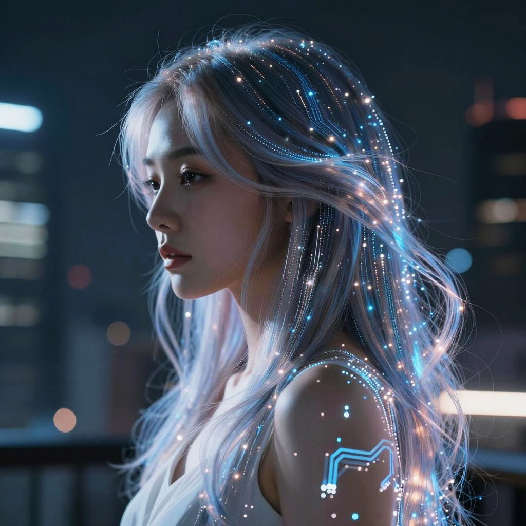 Free AI hairstyle design portraying hair as a dynamic digital display, shifting patterns and flowing lines of light, with an ethereal glow and embedded circuits visible beneath the strands, set in a dark futuristic cityscape at night.