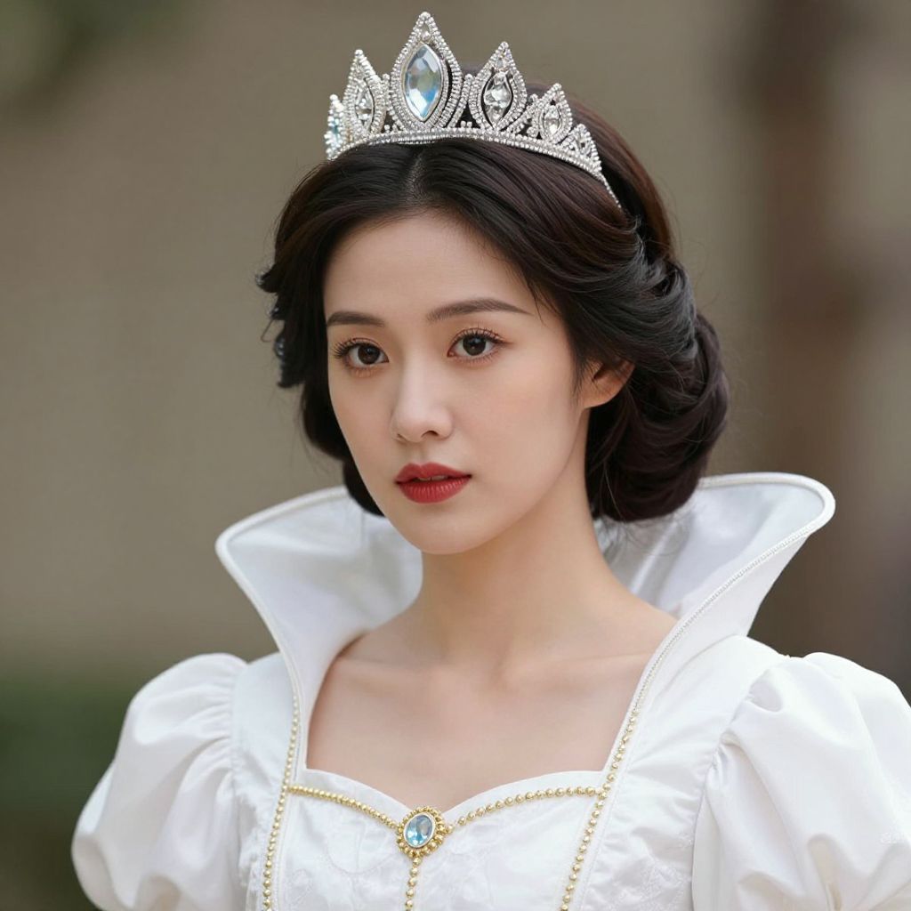 Photograph of an East Asian woman with fair skin and dark, wavy hair styled in an elegant updo. She wears a silver tiara with a central blue gem and a white, puffed-sleeve dress with a high, ruffled collar and gold trim. Her red lipstick contrasts with her pale complexion. The background is blurred, with green and brown tones suggesting an outdoor setting. The woman's expression is calm and composed, with a slight, subtle smile. The image has a soft, natural light, highlighting her features and the delicate details of her attire.