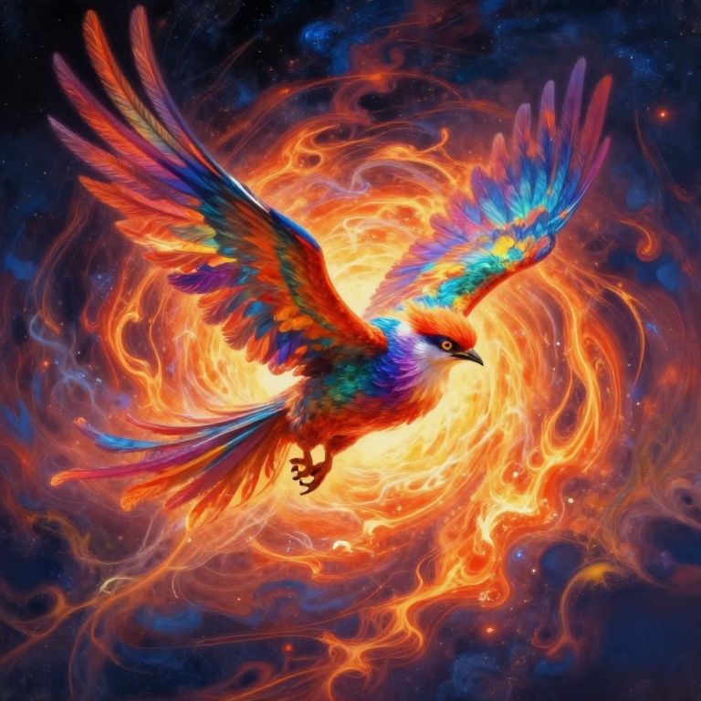 A majestic bird rises from the flames in an impressionistic oil painting style characterized by bold, expressive brushstrokes reminiscent of swirling patterns. The creature emerges from a fiery background, rendered with vivid strokes blending deep reds and oranges into a dynamic sky. From an aerial perspective, viewers witness the bird's awe-inspiring flight path, its iridescent feathers gleaming as it soars towards distant mountain ranges bathed in golden sunlight. This powerful scene evokes hope, renewal, and freedom through both its vibrant color palette and harmonious blend of nature and symbolism.