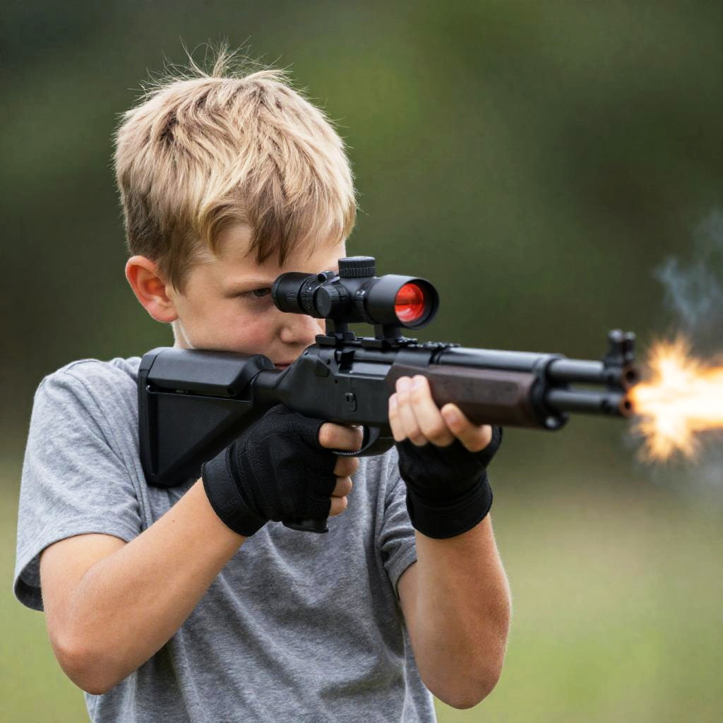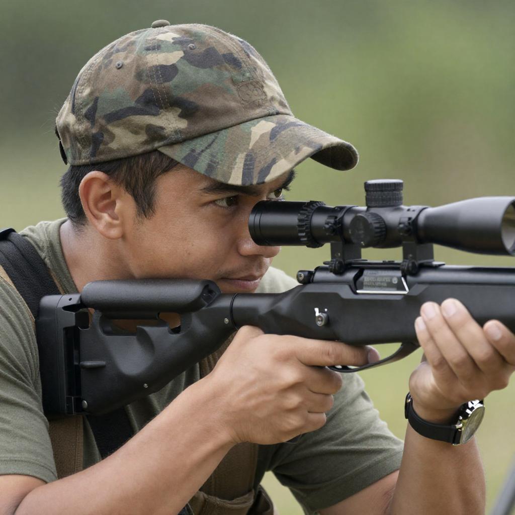 Close-up photograph of a man with a camo cap, intense expression, aiming a sniper rifle with a scope. He wears a green shirt and a watch. Blurred green foliage background. Right hand grips the rifle, left hand partially visible.