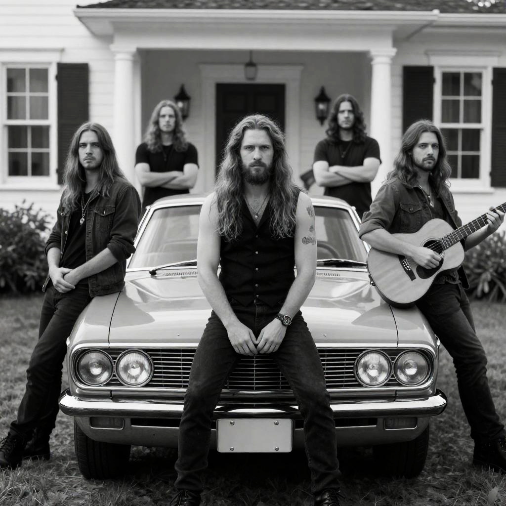 Photograph of three bloody, disheveled rock musicians with intense expressions. Central figure with long hair, arms raised, holding guitar. Left and right figures with beards, muscular, shirtless, also holding guitars. Large red-hued, demonic face in background. Industrial setting with dim lighting and fog.