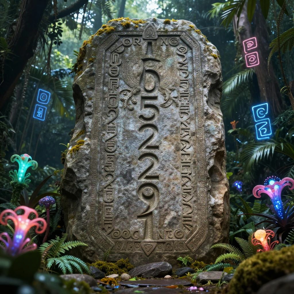 The number 4052974641 depicted as an ancient mystical sequence carved into a giant stone tablet, surrounded by lush jungle and glowing bioluminescent plants, mysterious runes floating around, magical fantasy atmosphere, ultra detailed