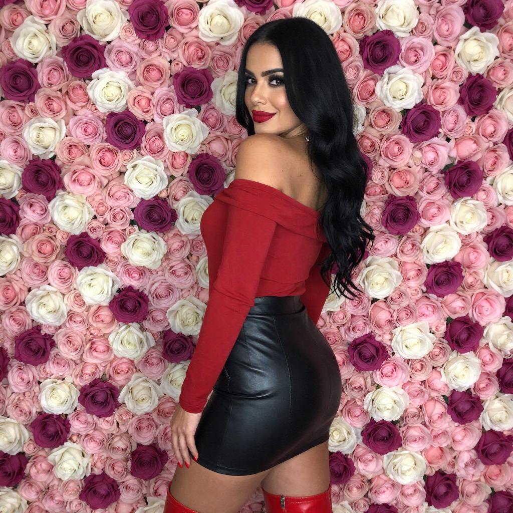 Photograph of a woman with long black hair, fair skin, and red lipstick, wearing an off-shoulder red top, black leather skirt, and red thigh-high boots. She stands against a vibrant floral wall of pink, white, and purple roses, smiling over her shoulder.