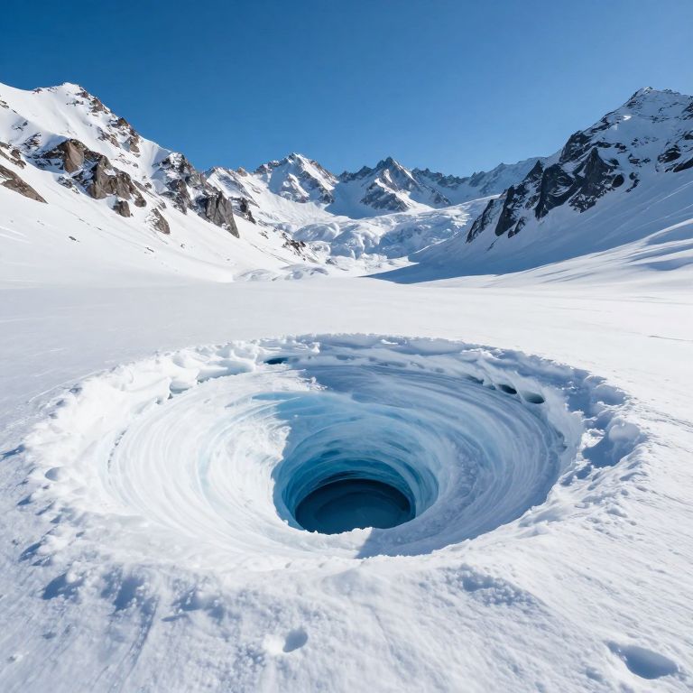 Spiraling ice forms a mesmerizing, concentric tunnel in a vast, snow-covered landscape, surrounded by jagged mountain peaks under a clear blue sky.