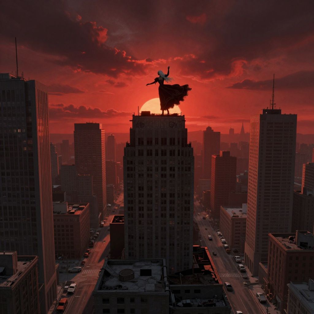 A digital illustration from a surrealistic perspective showcases an expansive urban landscape with imposing skyscrapers reaching towards a tempestuous sky. This eerie scene is illuminated by a blood-red sunset, casting long shadows across the empty streets and abandoned vehicles, evoking feelings of solitude and despair. At the heart of this desolate setting, a solitary figure stands atop one of the tallest buildings, silhouetted against the fiery horizon - a woman with flowing white hair, clad in an ornate Victorian-inspired gown, seemingly defying gravity as she dances precariously at the edge of the roof. This haunting image symbolizes the enduring human spirit amidst the ruins of civilization, emphasizing the fragile nature of our existence and the search for hope in the face of overwhelming adversity.
