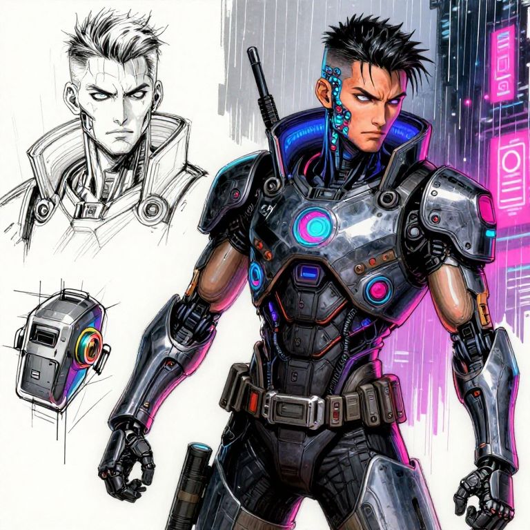 Concept sketches of a cyberpunk character, sharp ink detailing futuristic armor and neon-lit gadgets, expressive facial features with glowing cybernetic implants, dynamic pose in a rain-soaked neon city backdrop, bold contrasts emphasizing high-tech dystopian style.