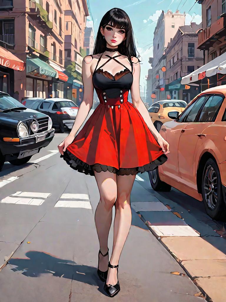 Digital art: Gothic woman with black hair, red and black dress, black lace trim, strappy heels, walking on sunny city street.