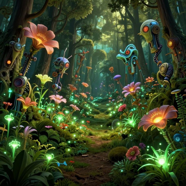 Craft an image embodying the surreal and fantastical world reminiscent of Hieronymus Bosch's enigmatic paintings, depicting a 'bug's-eye view' perspective of a lush, verdant jungle landscape. This scene should be teeming with oversized insects, peculiar animals boasting impossible anatomy, and ethereal plants that defy natural laws, all enveloped in an otherworldly color palette evoking both wonder and unease. Utilize advanced digital techniques to capture intricate details and create a rich, atmospheric composition that highlights the interplay of light and shadow, resulting in a mesmerizing and thought-provoking visual experience.