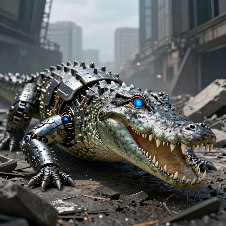 Digital art of a menacing, green, scaly crocodile with glowing red eyes, sharp teeth, and a wide open mouth, in a dark,