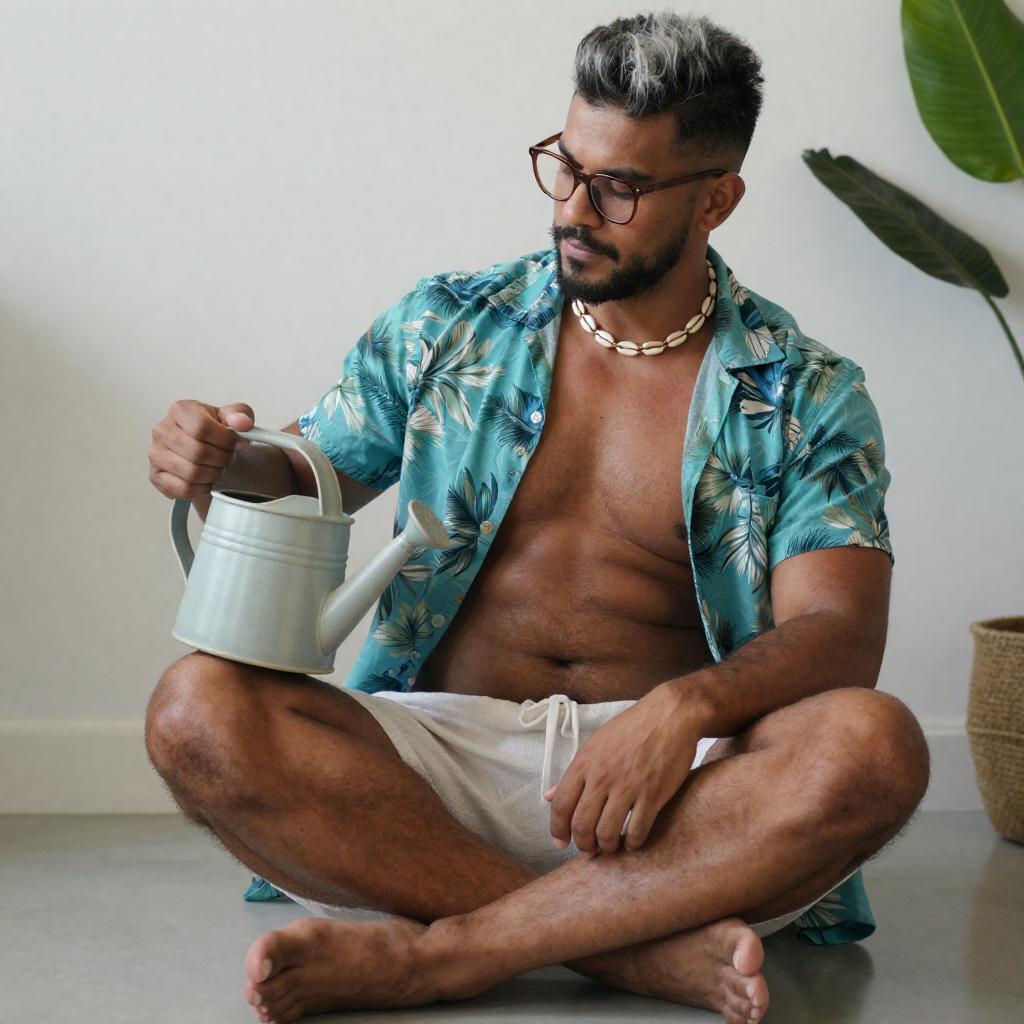 Full body, 1boy, solo, mature male, muscular male, salt-and-pepper pompadour with a subtle widow's peak, trimmed Van Dyke beard, dark-skinned male, sitting, barefoot, turquoise aloha shirt half-buttoned and white drawstring linen pants, bronze-rimmed reading glasses and shell necklace, holding ceramic watering can, blush, pectorals, thick thighs, hairy, chest hair, arm hair, leg hair, plump, bulge, pectoral cleavage, belly, plant