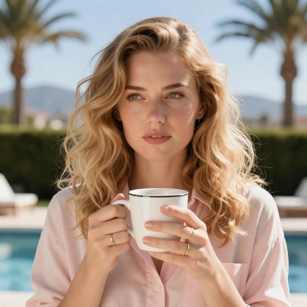 Photograph of a blonde woman with curled hair, wearing a pink shirt, holding a white cup with a black rim. She gazes to the side with a slightly pensive expression. Background includes palm trees, a hedge, and a distant mountain range. Bright, sunny outdoor setting. Woman's hands have rings. Blue sky. Pool in the background.