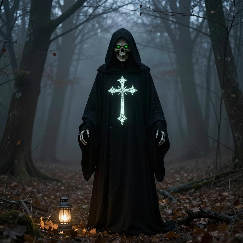 A dark, hooded skeletal figure standing in an eerie, misty forest at night. The figure wears flowing black robes with an intricate glowing cross design on the chest. Glowing green eyes shine from the skull beneath the hood. Leafless trees surround the figure, with a small glowing lantern on the ground illuminating the forest floor covered in fallen leaves. The atmosphere is mysterious and supernatural.