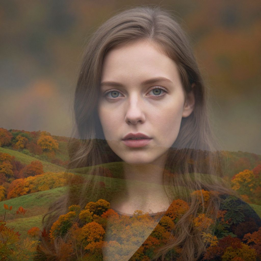 A portrait photograph portrays a young woman with porcelain skin and captivating green eyes, her delicate features softly veiled by an ethereal mist. Superimposed upon this image is a dreamlike landscape of rolling hills awash in vibrant autumn foliage, creating a mesmerizing double exposure where the woman's silhouette gracefully emerges from the swirling leaves. The contrast between the sharp detail of her portrait and the blurred, textured backdrop evokes a sense of mystery and wonder, inviting viewers to delve into the profound connection between nature's beauty and human emotion.