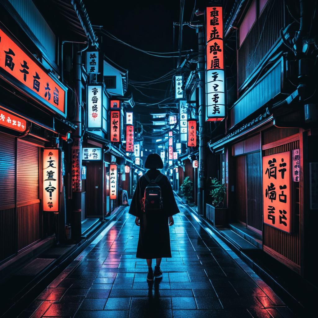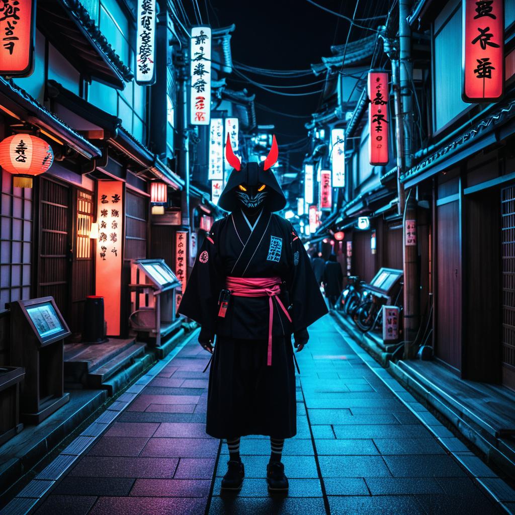 A person dressed in traditional samurai armor with a horned helmet walks down a narrow street illuminated by neon lanterns and signs in a vibrant cityscape at night, reflecting a futuristic Japanese aesthetic.