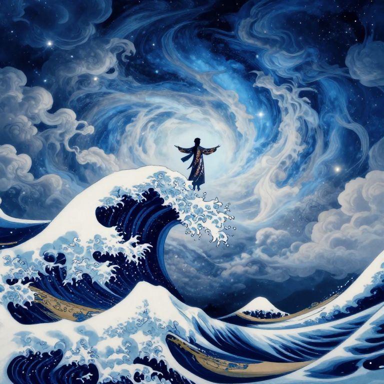A celestial dreamscape inspired by the intricate patterns and vibrant colors of Hokusai's \"The Great Wave off Kanagawa,\" but viewed from an aerial perspective. A mesmerizing swirl of clouds in various blues and whites dominates the sky, with glowing orbs reminiscent of planets or stars embedded within their depths. The central figure stands atop one of the wave-like formations, arms outstretched as they embrace both the beauty and potential danger of this environment. Wearing a robe adorned with shimmering metallic accents that reflect the soft ambient light, the enigmatic character casts an aura of mystery over the scene. This fantastical fusion of nature and cosmic elements shifts the mood from serene to awe-inspiring, evoking wonder and introspection in the viewer as they explore its captivating beauty.
