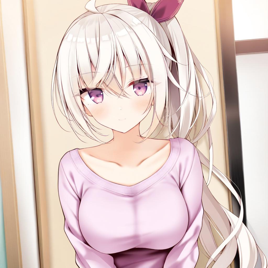 Akizuki kanna, cafe stella to shinigami no chou, 1girl, hair between eyes, purple eyes, eyes visible through hair, eyelashes, very long hair, white hair, light brown hair, ahoge, crossed bangs, side ponytail, sidelocks, hair ribbon, large breasts, collarbone, long sleeves, by artist oouso, animagine
