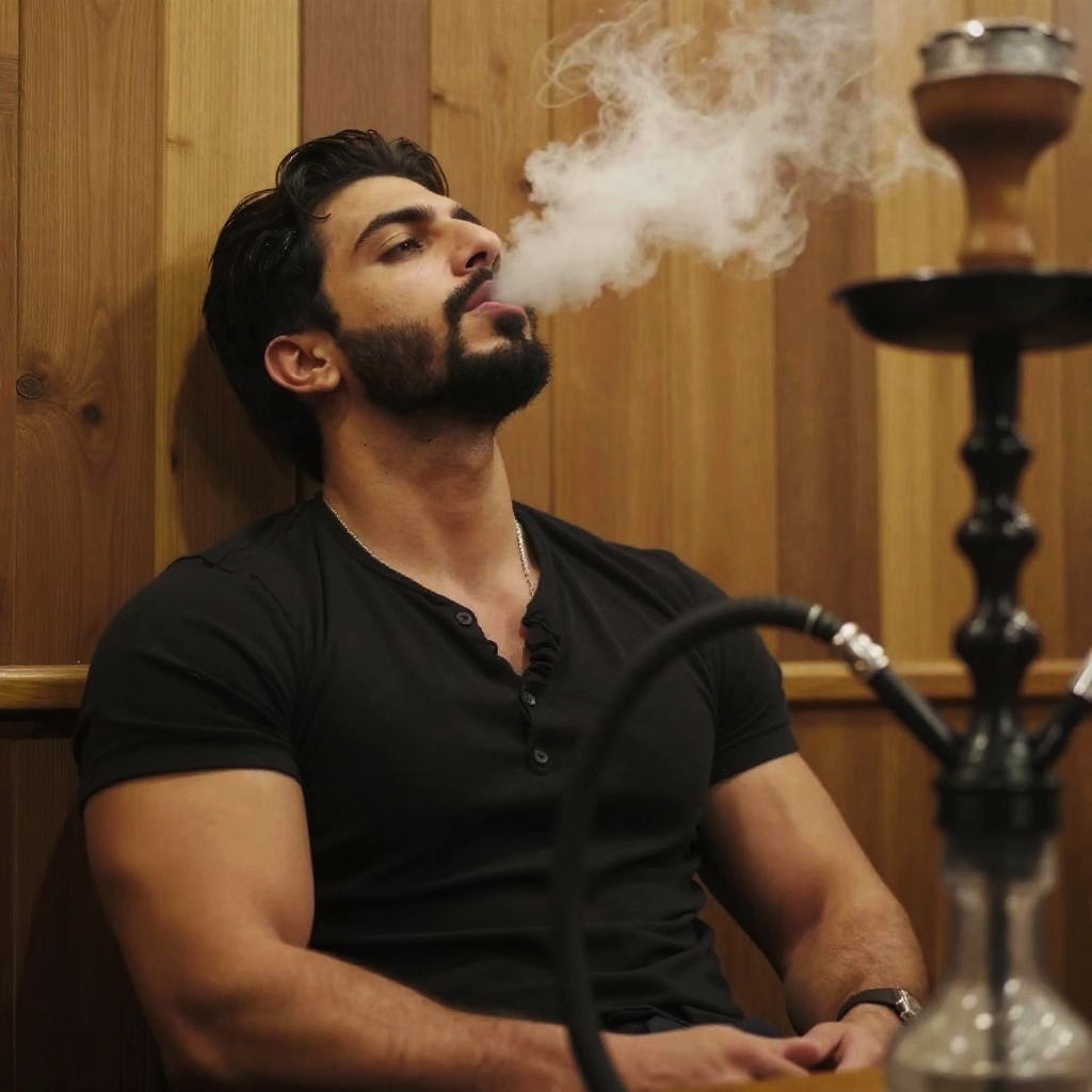 Photograph of a muscular man with dark hair and beard, wearing a black shirt, sitting back and exhaling smoke from a hookah. He's looking upwards with a relaxed expression. The background is a wooden wall with warm, yellowish lighting. The hookah is black with a shiny finish, positioned in the lower right. The image has a casual, slightly blurred style.