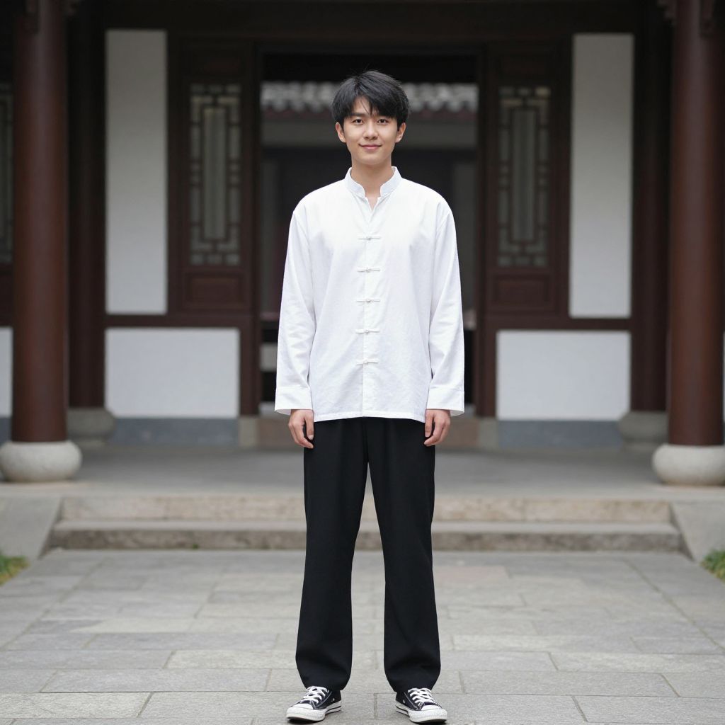 Photograph of a young East Asian man with short black hair, wearing a white long-sleeve shirt, black pants, and black shoes, standing