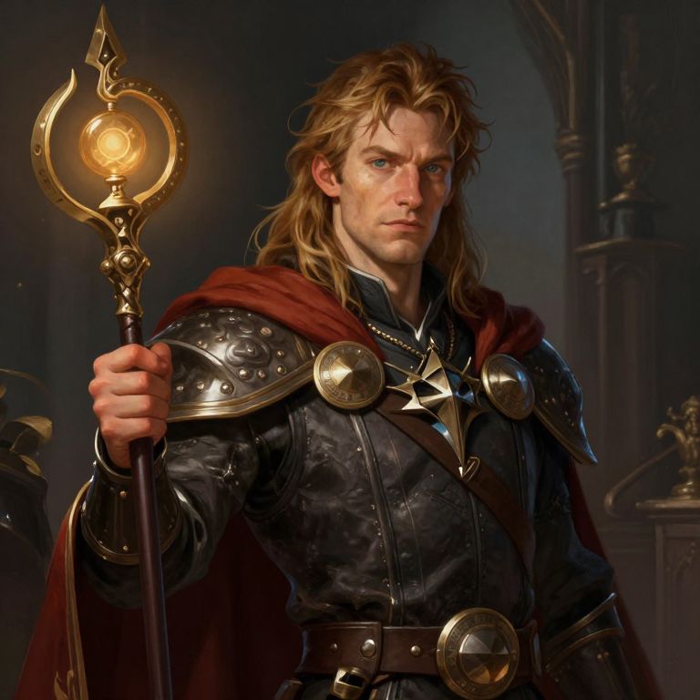 A digital illustration depicts a muscular, fair-skinned man with long, wavy blonde hair and intense blue eyes. He wears dark, ornate armor with silver shoulder plates and a red cape. A golden star hangs on his chest, and he holds a glowing, intricately designed staff with a circular top. The background is dark and mystical, with faint architectural details. His expression is serious and determined. The lighting highlights his facial features and the staff's glow, creating a dramatic, heroic atmosphere. The style is reminiscent of fantasy video game art.