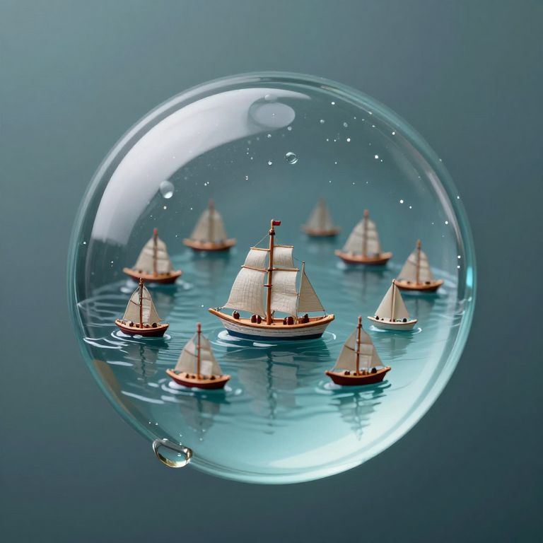 Photorealistic digital image of a glass bubble containing tiny sailboats with white sails and brown hulls, floating on calm blue water.