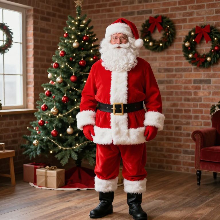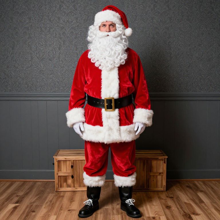 A photograph of a person standing indoors, dressed as Santa Claus. They're wearing a red velvet suit with white fur trim, a black belt, white pants, and black shoes with white laces. They have a white beard and a Santa hat, looking slightly to the side. The background features dark gray, patterned wallpaper with wainscoting and wooden floors. Two small wooden boxes are on the floor behind them.