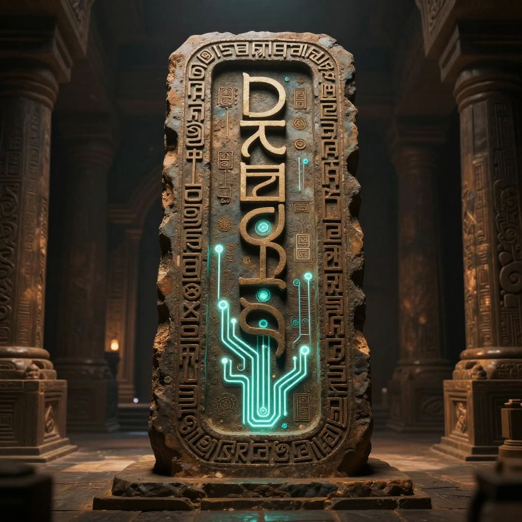 Year:drqet803ntg= portrayed as a mysterious encrypted artifact in an ancient temple combined with futuristic tech motifs, ancient runes glowing with modern circuitry, soft ambient light highlighting textures, highly detailed, fantasy sci-fi fusion
