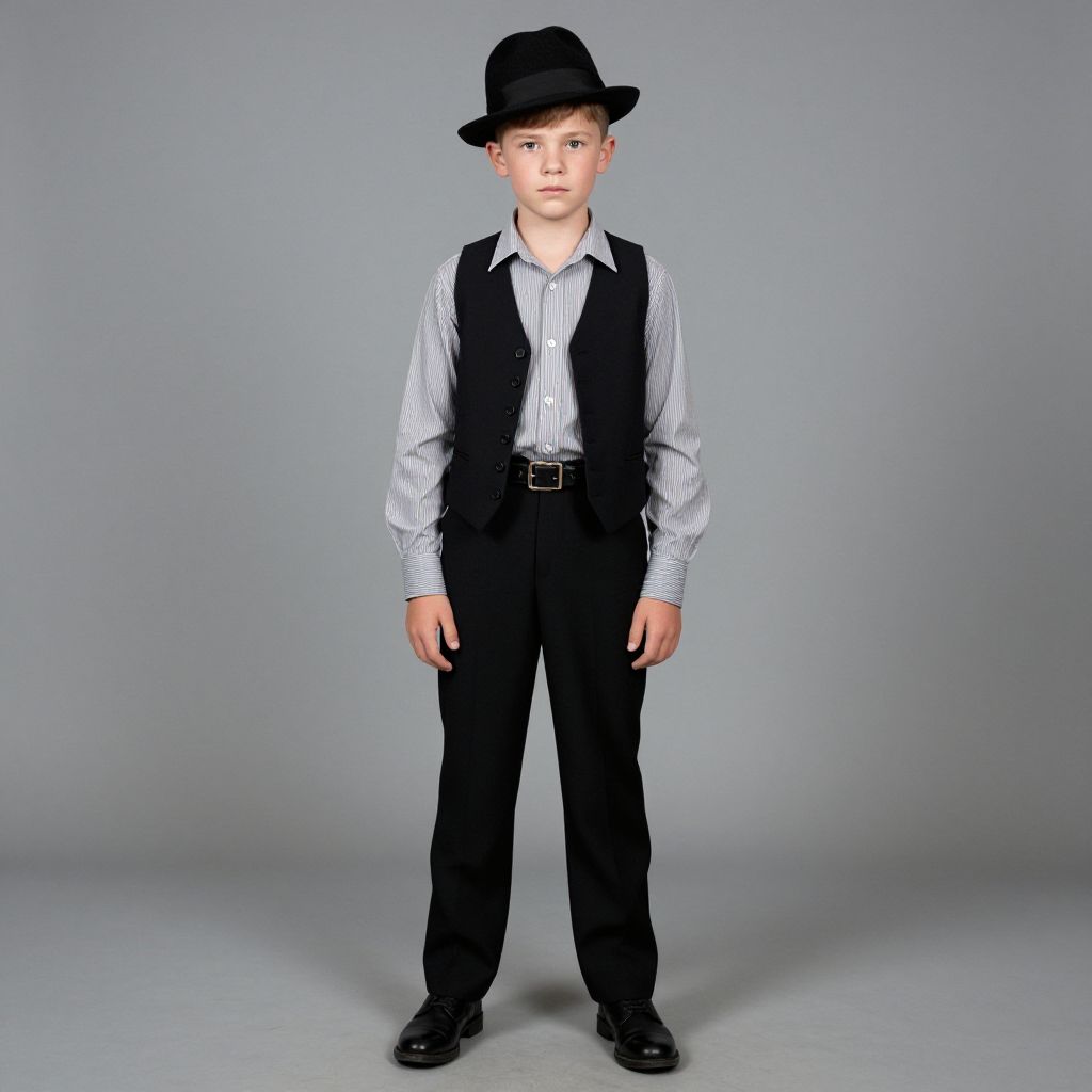 Photograph of a young boy standing against a gray background, wearing a black vest, striped shirt, black pants, black shoes, and a black fed