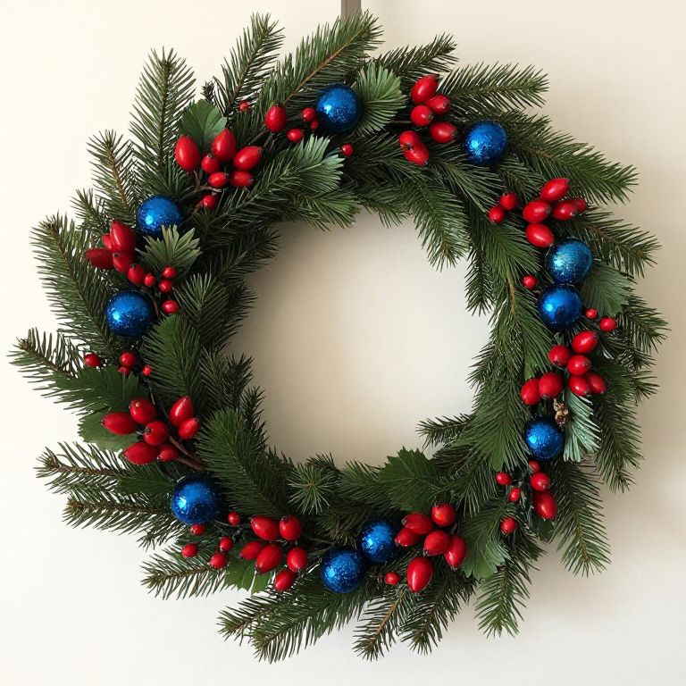 Photograph of a festive Christmas wreath with lush green pine branches, interspersed with shiny blue and red berries, creating a vibrant, circular holiday
