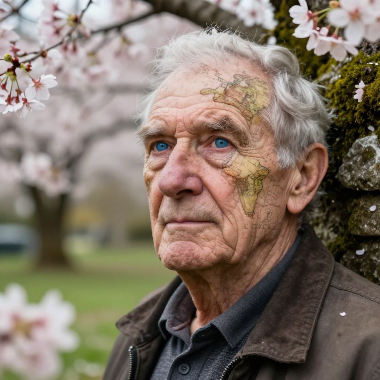 Photograph of an elderly Caucasian man with wrinkled skin, blue eyes, and white, slightly curly hair. He wears a dark brown jacket over a black shirt. His face is partially superimposed with a world map, emphasizing his forehead and cheek areas. He stands outdoors against a blurred background of pink cherry blossoms and a tree trunk, with green grass visible in the distance. The lighting is natural, highlighting the texture of his skin and the delicate petals of the cherry blossoms. The overall mood is contemplative and serene.
