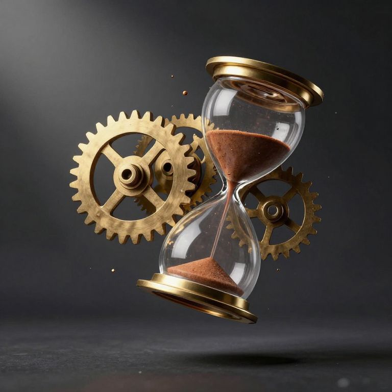 Digital artwork of a gold-rimmed hourglass with gears, showing sand flowing, set against a dark, gradient background.