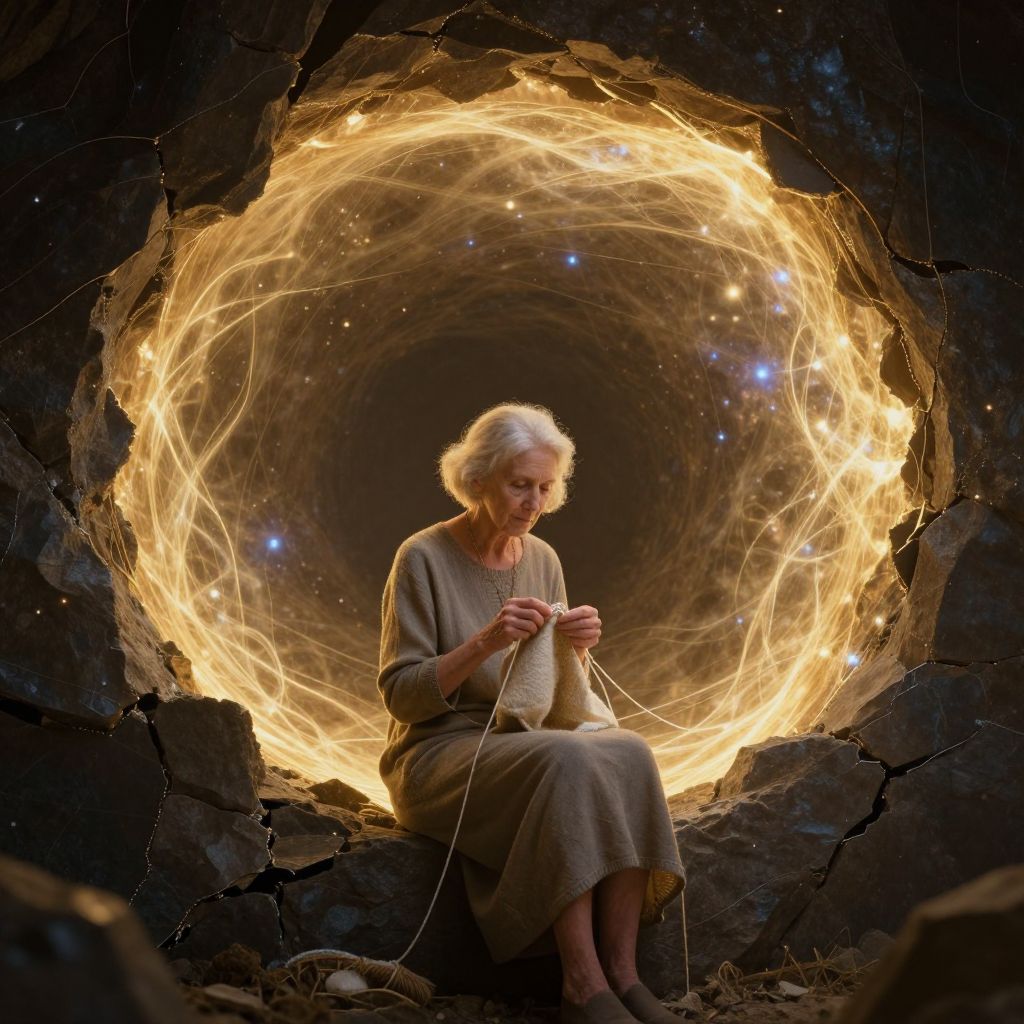 Photograph of an elderly woman with short, white hair, sitting on a rocky surface, surrounded by a glowing, circular vortex of light reminiscent of a wormhole or cosmic whirlpool. She wears a long, beige, loose-fitting dress and is focused intently on knitting, holding the yarn in both hands. The light behind her is bright and golden, with small, twinkling blue stars scattered throughout the vortex. The rocky background is dark and textured, contrasting with the luminous circular light. The overall composition blends elements of fantasy and realism, creating a surreal, otherworldly atmosphere.