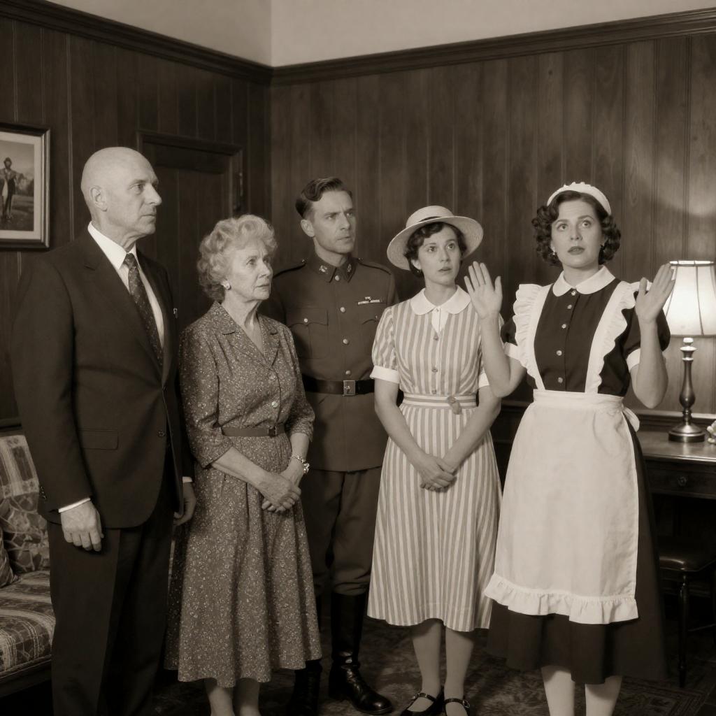 Black and white photo featuring three individuals in vintage attire standing outdoors in a wooded park. On the left is a woman wearing a white bonnet and apron, holding a bouquet of flowers with a serious expression. In the center stands a military officer dressed in a dark, formal uniform with a peaked cap and polished boots, maintaining a neutral expression. On the right is a man in a dark suit and bowler hat, holding a cane and displaying a surprised look. The scene includes a bench and blurred figures in the background, conveying a historical or period setting.