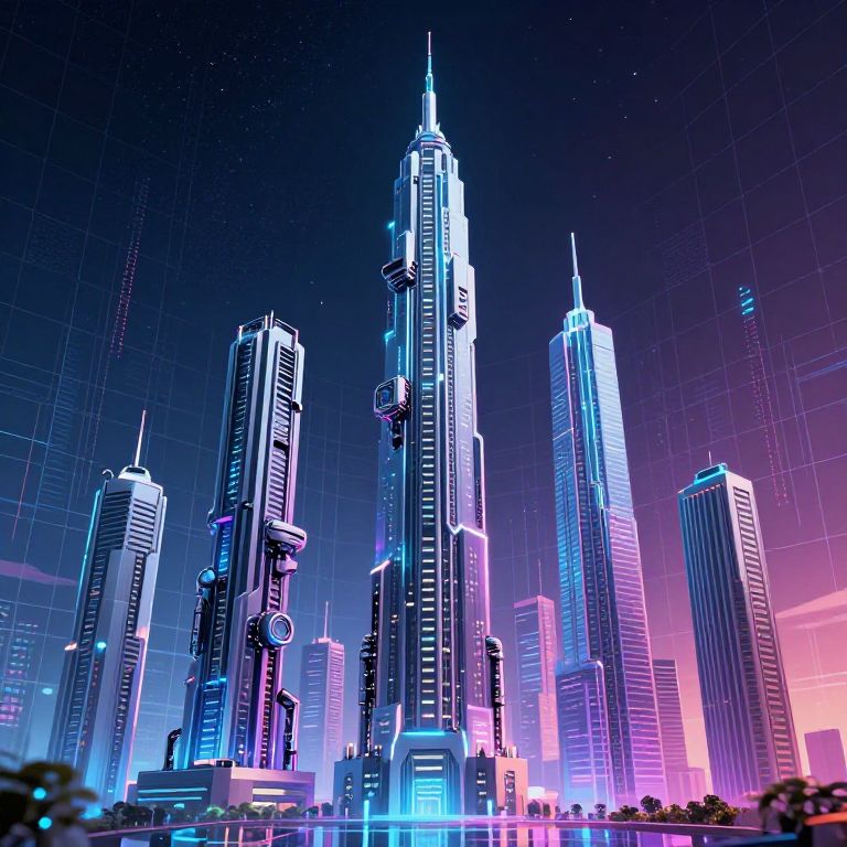 Digital illustration of tall, robotic-like towers with AI design elements, standing in a vibrant tech-inspired cityscape featuring glowing gridlines and data streams under a starry sky. The scene depicts a surreal fusion of AI technology and futuristic architecture with prominent neon blue and purple lighting.